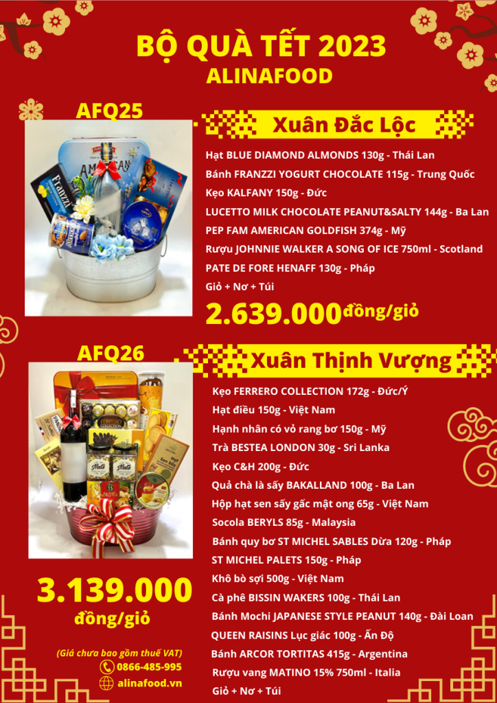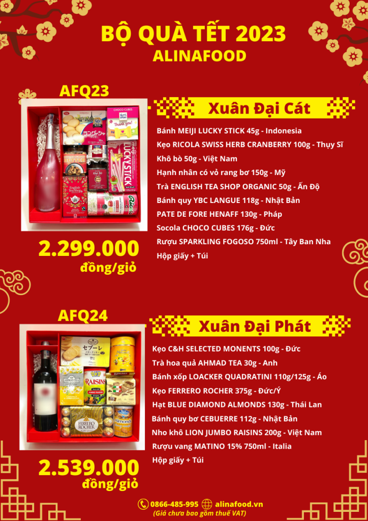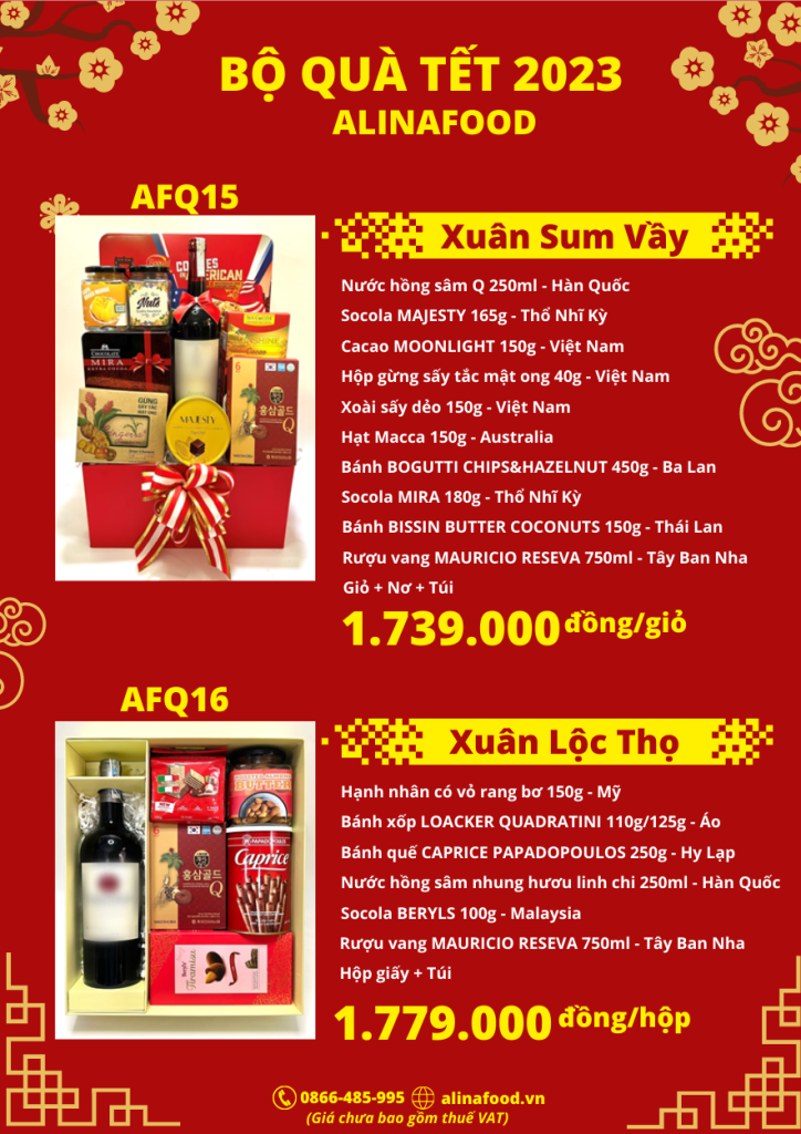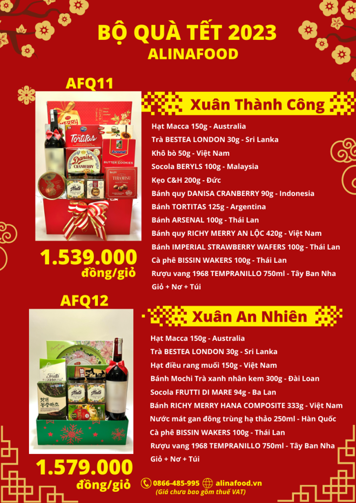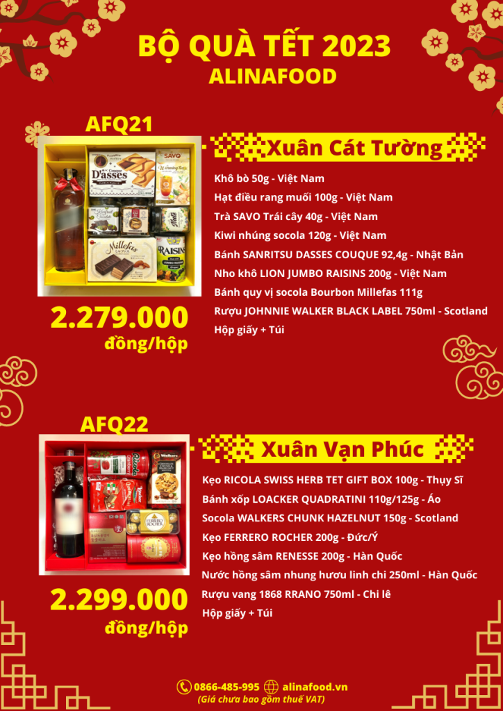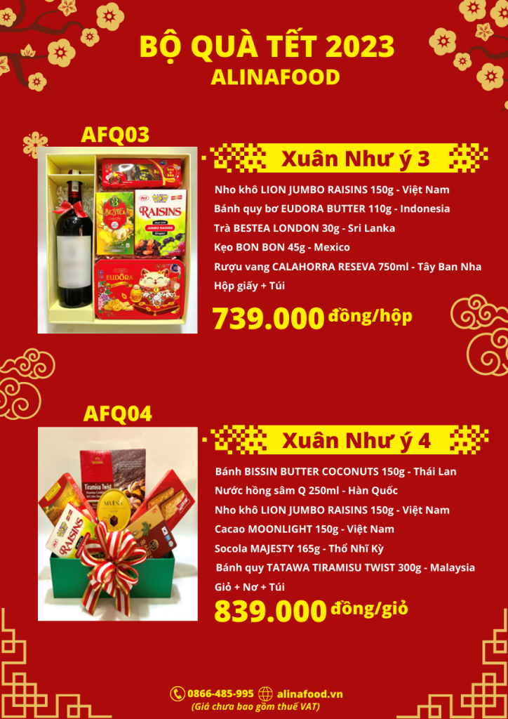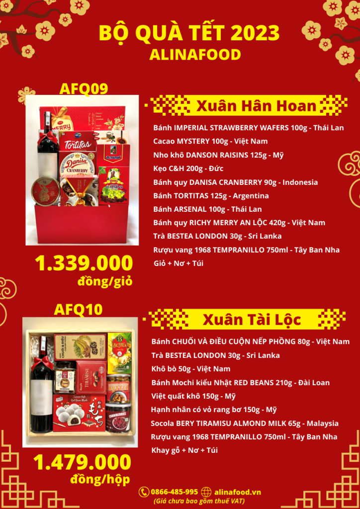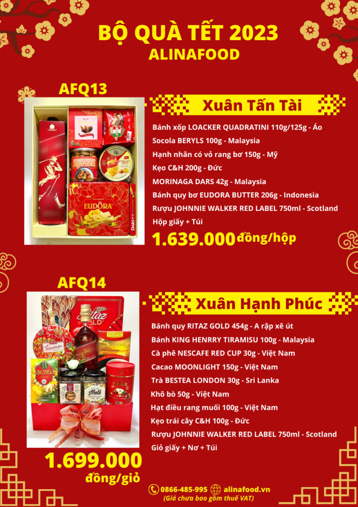 - Cách đặt quà Tết: Tại cửa hàng AlinaFood, qua điện thoại hotline (Zalo): 0866 485 995 – 0911 454 849 hoặc qua Zalo Page của AlinaFood (Mục Sản phẩm).